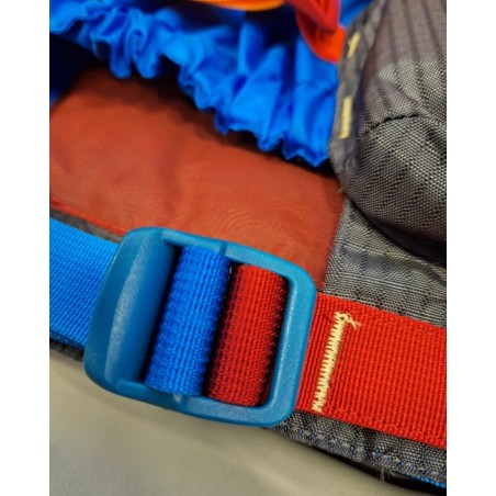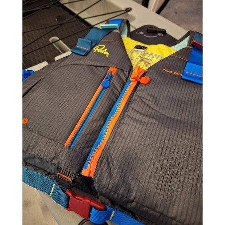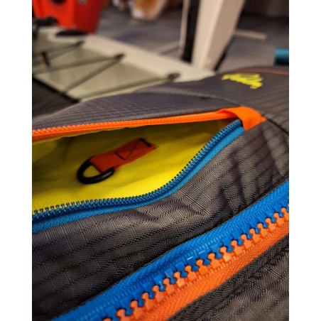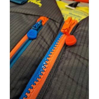 Lekka oraz smukła kamizelka, zapinana na zamek z przodu, regulowane pasy naramienne oraz boczne, bezpieczne zamknięcie na klamrę w talii oraz kieszonka zapinana na zamek.
